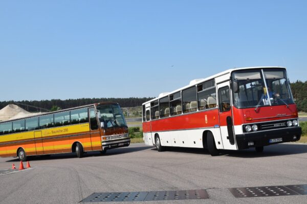 Es ist ein ungewöhnliches Aufeinandertreffen auf dem Testgelände in Linthe: Zwei Reisebusse aus den 1970er-Jahren stehen sich gegenüber – ein westdeutscher Setra-Prototyp und ein ungarischer …